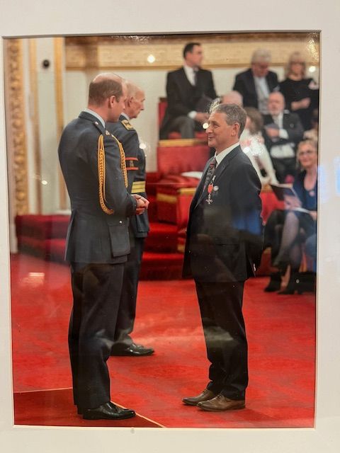 Jason Shela receiving the MBE award from Prince William at Buckingham Palace on behalf of Her Majesty Queen Elizabeth II.