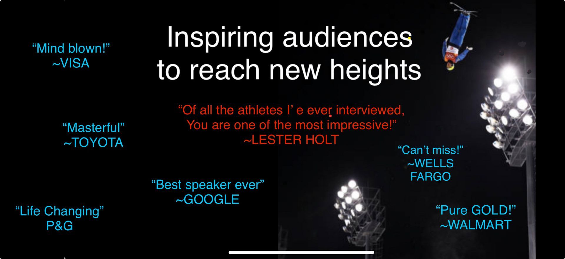 “Of all the athletes I’ve interviewed, you were one of the most impressive. You make a powerful & relevant connection between being a champion on the slopes and in the workplace.”